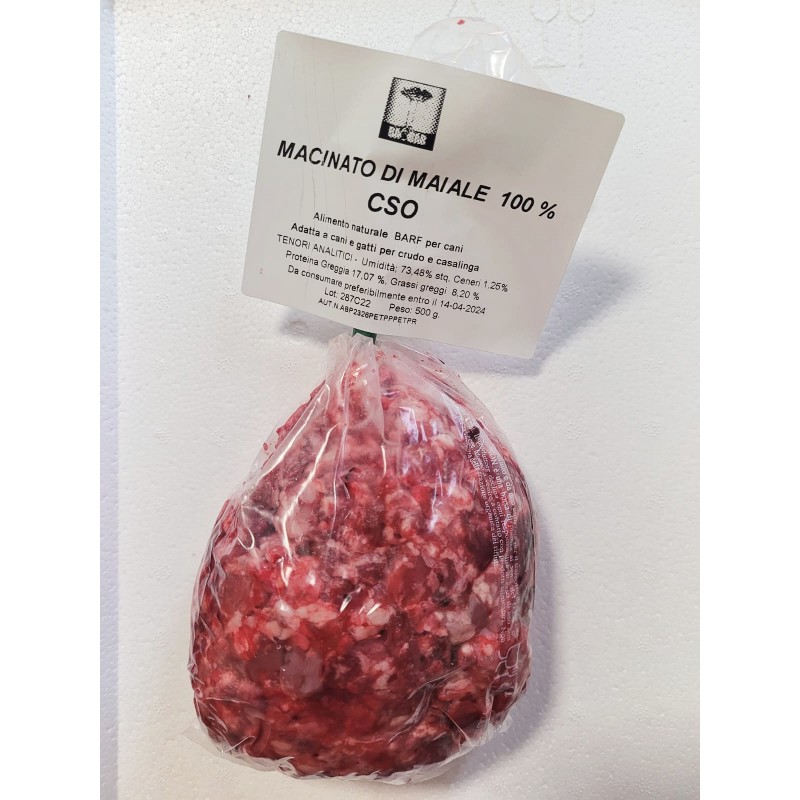Carne di maiale: anche se utilizzabile solo cotta, anche all'interno di una dieta BARF la carne di maiale può essere una ottima fonte di ferro, rame e oliogoelementi come magnesio e potassio. Il grasso presente in questo taglio inoltre apporta Vitamina D e acido linoleico, quest'ultimo essenziale nel cane e non presente in carni di bovino o ovino.