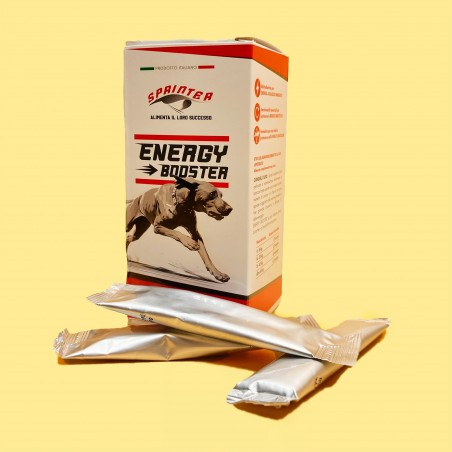 ENERGY BOOSTER è un alimento complementare in pratiche confezioni stick monodose, formulato appositamente per supportare il cane atleta durante competizioni sportive e attività venatorie. Grazie alla sua composizione mirata, ENERGY BOOSTER fornisce un apporto energetico completo, soddisfacendo le diverse fasi del fabbisogno energetico del cane.